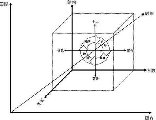 综上所述,我们认为,中国新闻传播研究已经来到了历史发展道路的紧要关头,需要在国际、国内两 个面向、政治一经济一文化一社会四个维度所构成 的制度一关系一结构这一体系空间内,确定本学科研究的历史方位与坐标(如下图所示)。