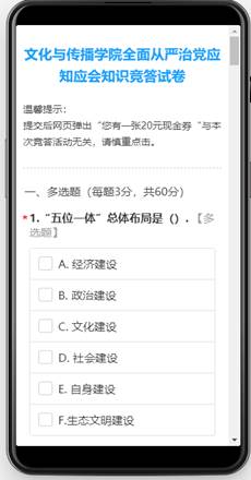 为进一步深入学习习近平新时代中国特色社会主义思想和党的十九大精神,营造坚定不移深入推进全面从严治党的浓厚氛围,为加强党员政治理论知识学习,有效利用“碎片时间”,深化理论学习的效果,学院党总支于2020年6月30日至7月1日组织全体党员开展 “迎七一·全面从严治党应知应会在线知识竞答”活动,以此方式向七一献礼。学院党总支在这次活动中加强对全体党员的政治纪律教育,引导党员在学思践悟中增强纪律性,提高政治修养。