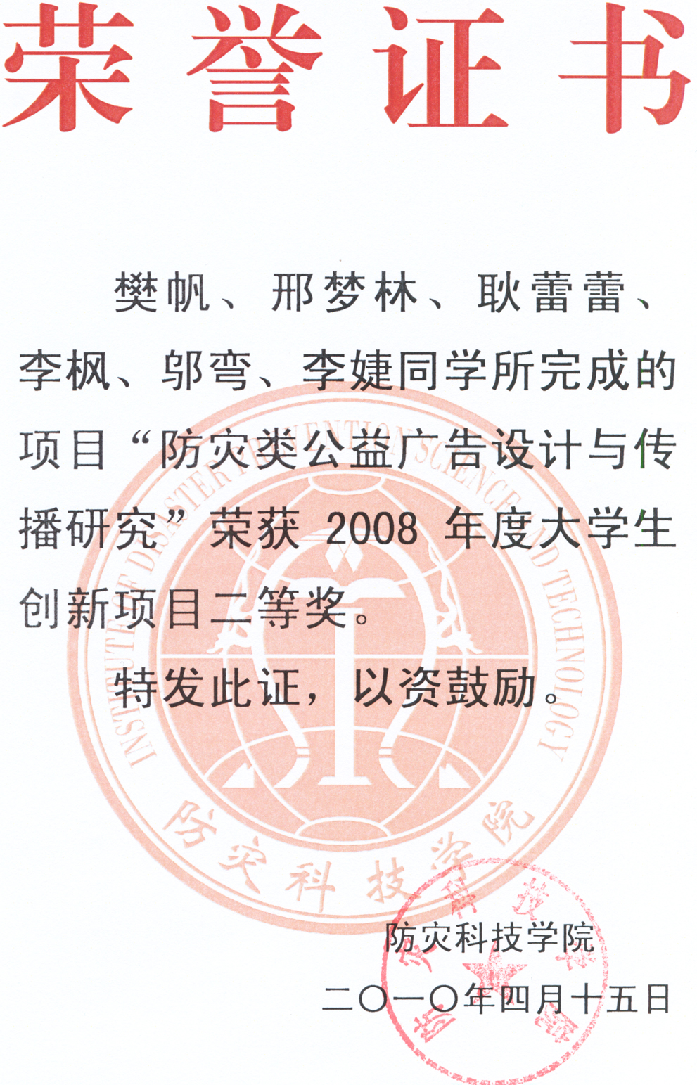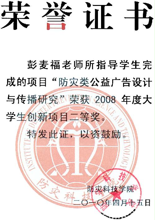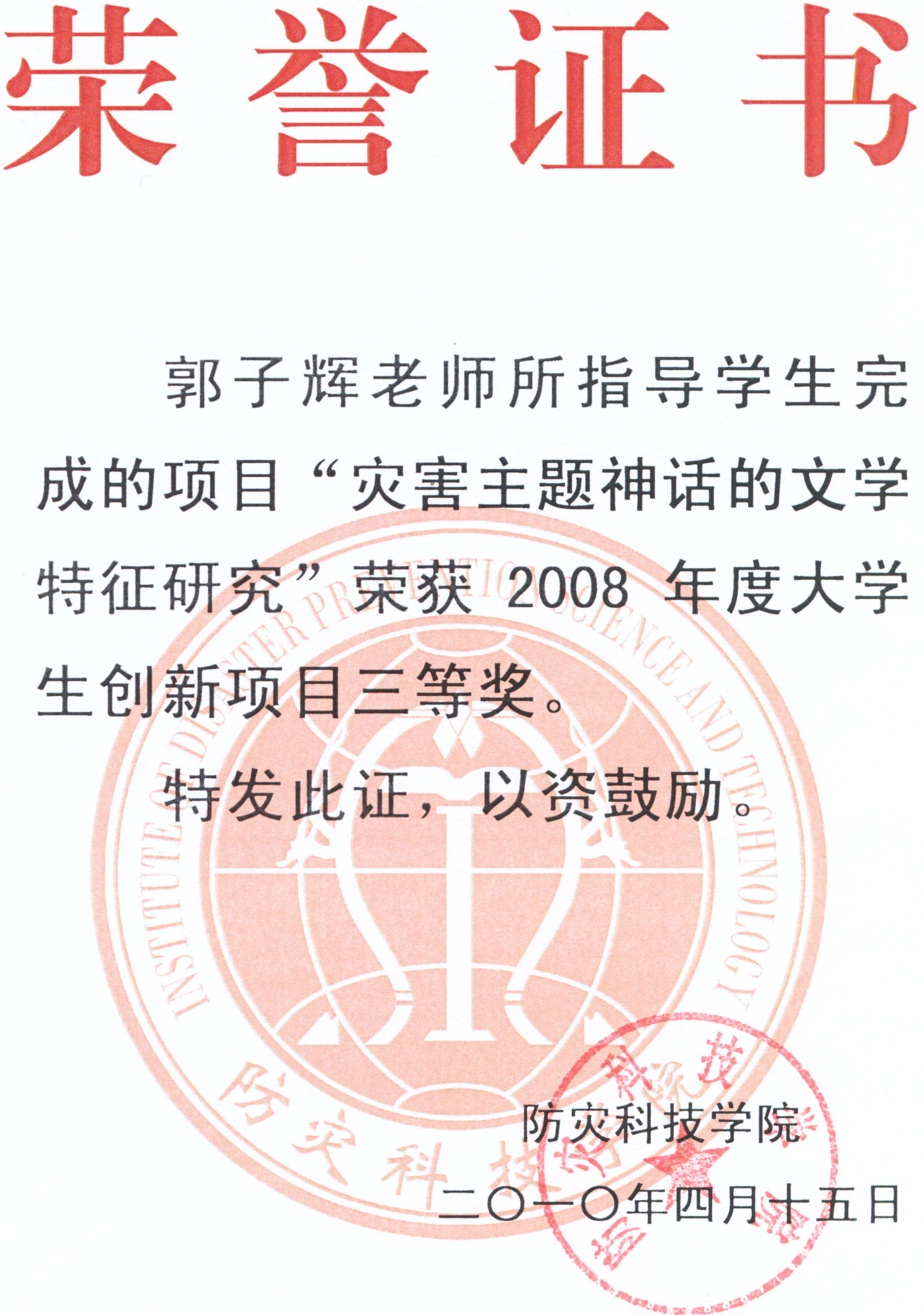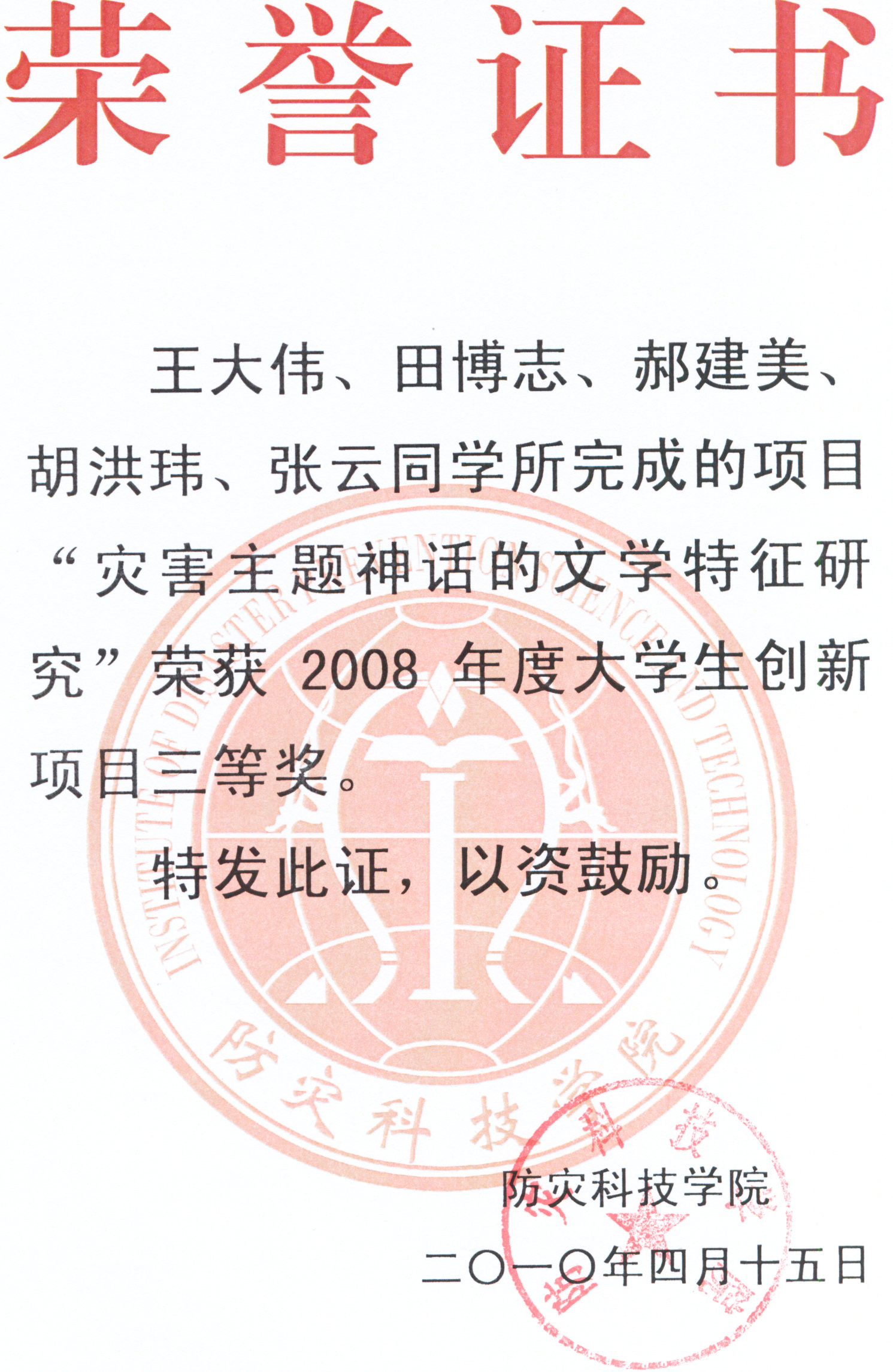 2010年5月6日下午, 第一届新葡萄官网AMG大学生创新项目汇报暨表彰大会在图书馆报告厅隆重举行。我系申报的两个创新项目均获奖,其中王大伟、田博志、郝建美、胡宏玮、张云同学所完成的项目“灾害主题神话的文学特征研究”荣获2008年度大学生创新项目三等奖,并于2010年4月在新葡萄官网AMG学报增刊1发表题为《从灾害主题神话看先民的应灾心理》的论文;广告学专业樊帆、邢梦林、李枫、耿蕾蕾、邬弯、李婕所完成的项目“防灾类公益广告设计与传播研究”荣获2008年度大学生创新项目二等奖,并于2010年4月在新葡萄官网AMG学报增刊1发表题为《防灾减灾主题公益广告技法浅究》的论文。