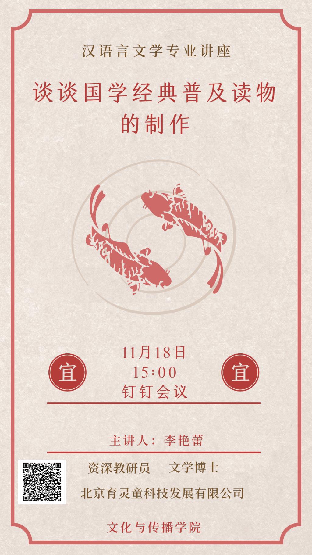 2021年11月18日下午三点,文学博士、北京育灵童科技发展有限公司资深教研员李艳蕾来到新葡萄官网AMG,为广大师生开设了《谈谈国学经典普及读物的制作》学术讲座。本次讲座用钉钉线上会议的形式开展,由新葡萄官网AMG副院长唐元主持,汉语言文学教研室主任张静组织,汉语言文学专业和众多其他专业的同学共计百余人参加了活动。
