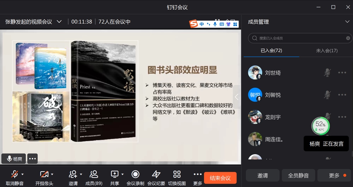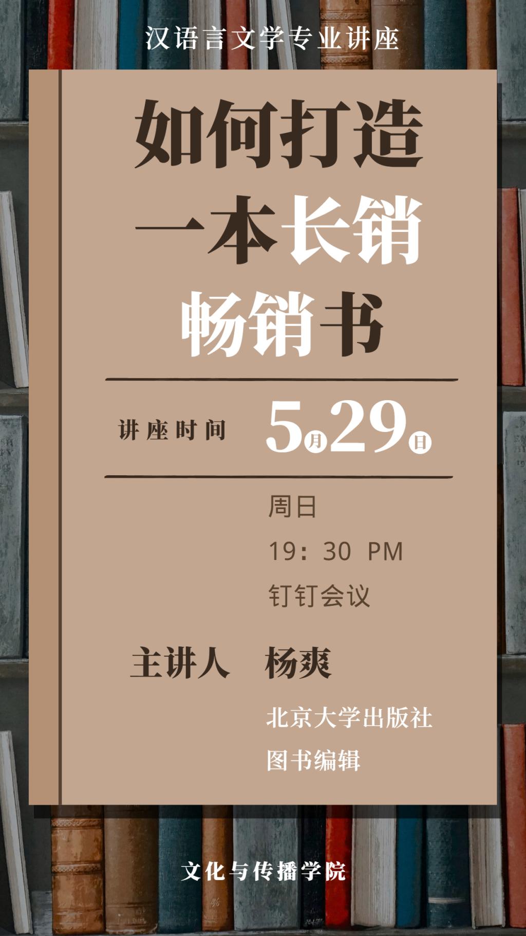 2022年5月29日晚七点,北京大学出版社图书编辑杨爽老师来到新葡萄官网AMG,为广大师生开设了《如何打造一本长销畅销书》的学术讲座。本次讲座用钉钉线上会议的形式开展,由汉语言文学教研室主任张静组织并主持,汉语言文学专业的师生参加了活动。