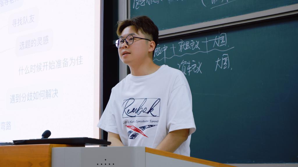 刘俊宏同学回顾了自己大学四年期间参加学科竞赛、新媒体学生组织工作、发表论文等创新实践经历,在参与各类比赛等方面为大家分享了自己的经验与见解。他鼓励同学们利用大学的宝贵时光,把自身专业学习和创新实践结合起来,做好个人规划、明确发展目标,积极探索并参与各类创新创业实践。