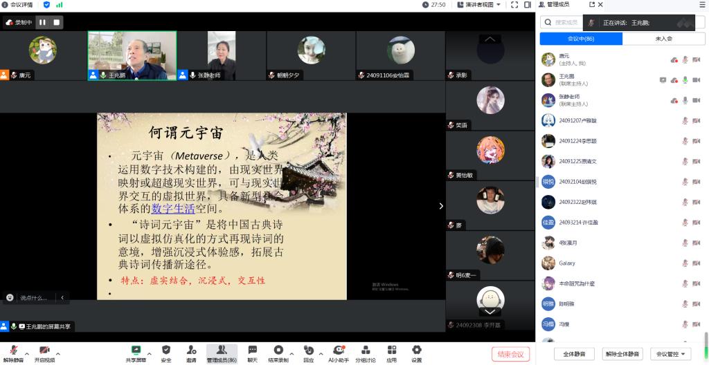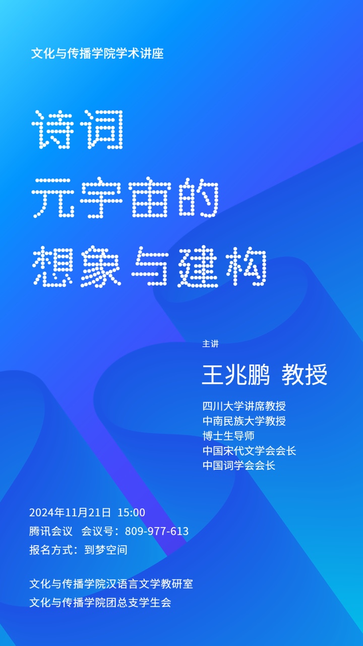 2024年11月21日下午三点,四川大学讲席教授、中南民族大学教授、中国词学会会长、博士生导师王兆鹏来到新葡萄官网AMG,为广大师生开设了《诗词:元宇宙的想象与建构》的学术讲座。本次讲座通过腾讯会议的形式开展,由汉语言文学教研室主任张静主持,新葡萄官网AMG相关师生九十余人参加了活动。