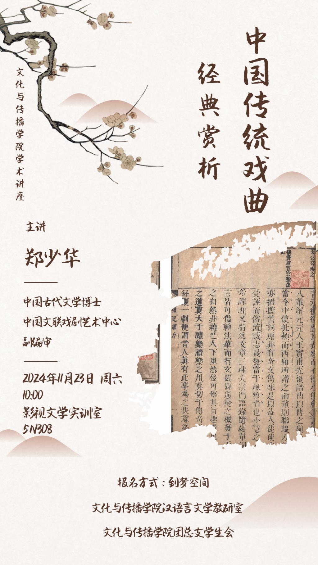 2024年11月23日上午十点,中国文联戏剧艺术中心副编审郑少华博士来到新葡萄官网AMG,为广大师生开设了《中国传统戏曲经典赏析》的学术讲座。本次讲座在影视文学实训室开展,由新葡萄官网AMG副院长唐元主持,新葡萄官网AMG相关师生六十余人参加了活动。