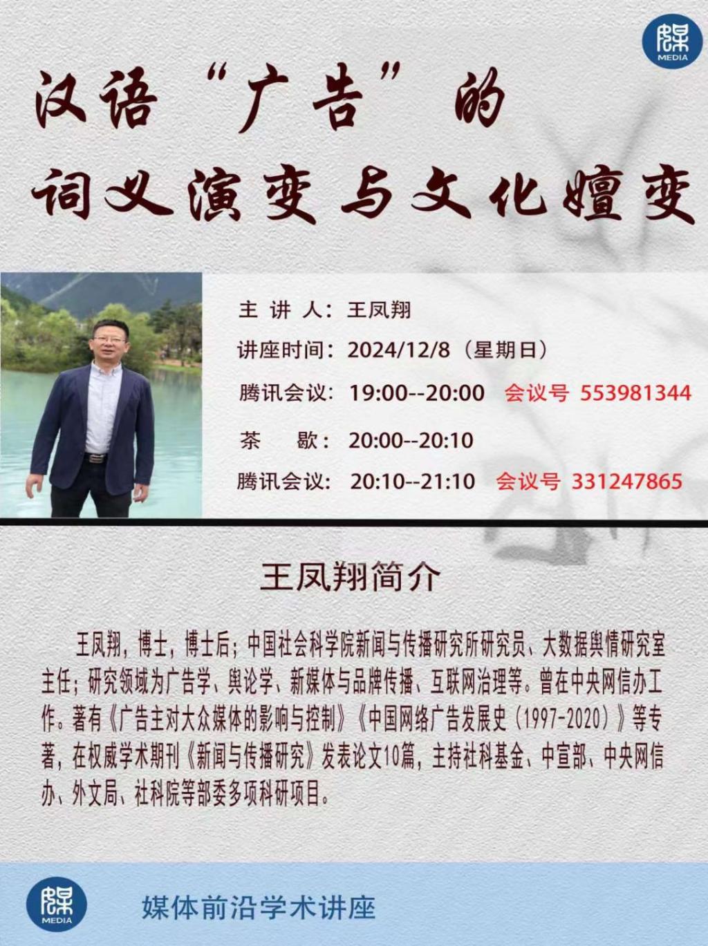 12月8日,中国社会科学院新闻与传播研究所研究员王凤翔莅临新葡萄官网,为网络与新媒体专业师生做了题为《汉语“广告”的词义演变与文化嬗变》的学术讲座。王凤翔研究员重点解析了汉语“广”“廣”的传播格局、“广告”的佛教传播与文化、商业广告的现代构建等。