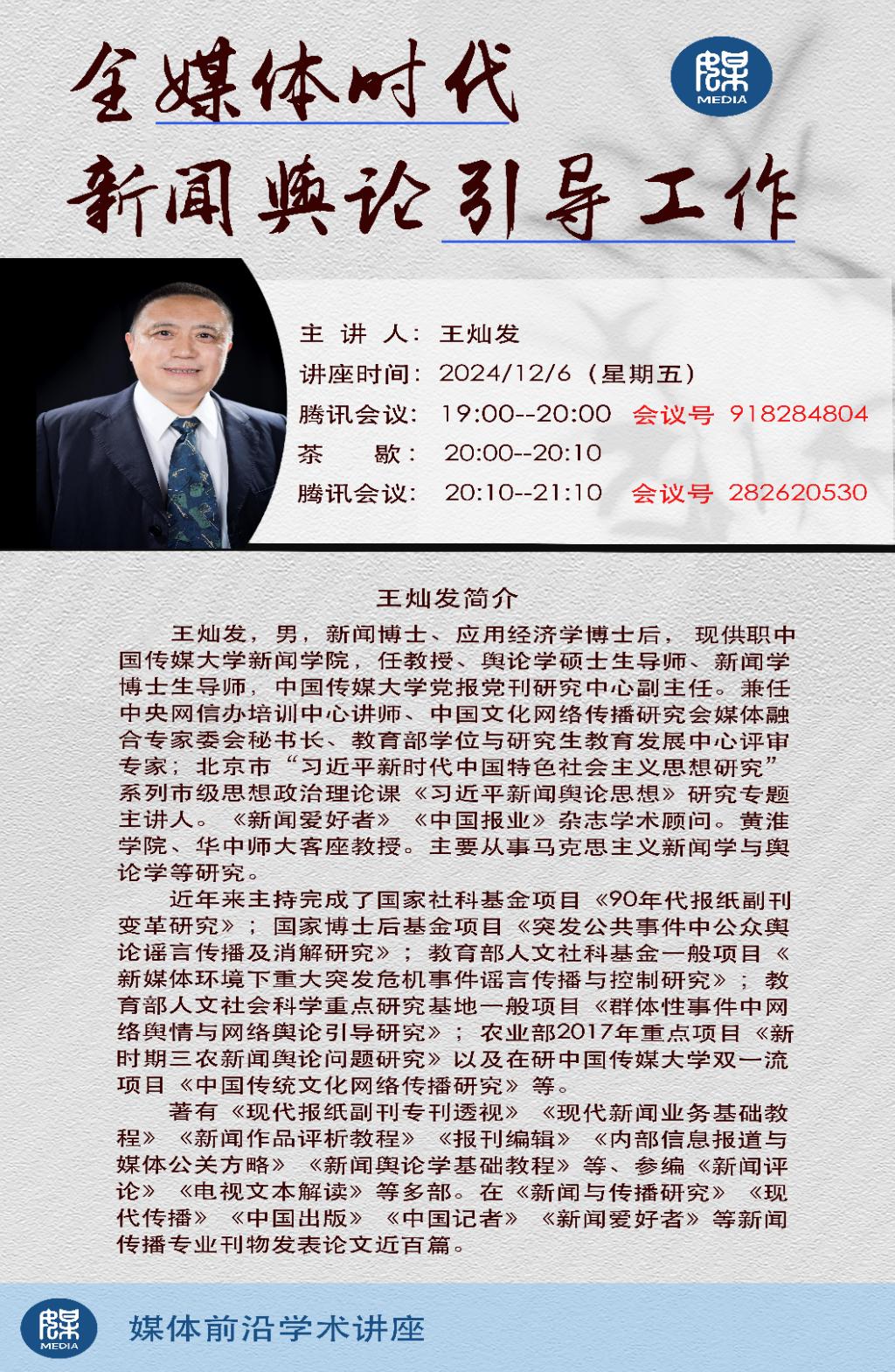 王灿发是新闻博士、应用经济博士后,现供职中国传媒大学新闻学院任教授、舆论学硕士生导师、新闻学博士生导师等。兼任中国文化网络传播研究会媒体融合专家委会秘书长、教育部学位与研究生教育发展中心评审专家等。近年来主持完成了多个项目,如国家基金社科项目«90年代报纸副刊变革研究»、国家博士后基金项目«突发公共事件中公众舆论谣言传播及消解研究»等。著有«现代新闻业务基础教程» «报刊编辑»等,在«新闻与传播研究»«中国记者» «中国出版»等新闻传播专业刊物发表论文近百篇。(张显慧 /记者)