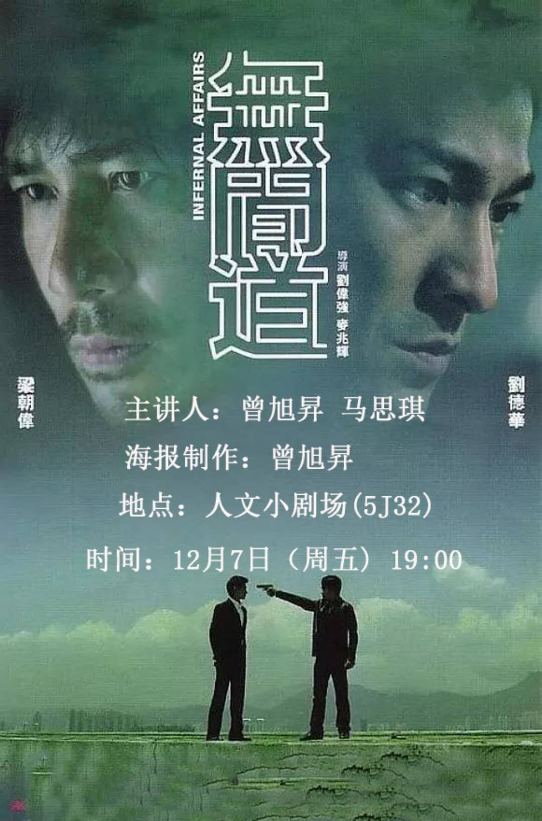 人文电影赏析活动将于12月7日(周五)晚七点,在人文小剧场(5J32)举行,本周将放映香港著名电影《无间道》。影片由刘伟强执导,由刘德华、梁朝伟、黄秋生、曾志伟等主演,主要讲述两个身份都本不该属于自己的人,几乎生活在一个类似无间地狱的环境里,做梦都怕别人拆穿自己的身份。这个世界里,到底什么才是生活的道理?做人的原则?进入无间地狱是没有轮回的,只有永远受苦,但片中的两位主角却在寻求轮回。这部电影无疑是多年来的香港警匪类型片的新突破,影片一改以往单一的线索和节奏,而将重点完全放到人物身上,不仅斗智斗勇,而且人物的性格塑造也更加丰满、全面。影片的线索复杂,节奏流畅,张力极强,内涵颇深。在摄影上,强烈的构图和极端的影调使得影片显得阳刚有力,音乐元素多样,各种风格融为一体,可以说这部电影是集艺术与观赏于一体的佳作。本期讲解员:曾旭昇、马思琪;海报制作:曾旭昇;指导老师:张静。欢迎广大师生前来观看。