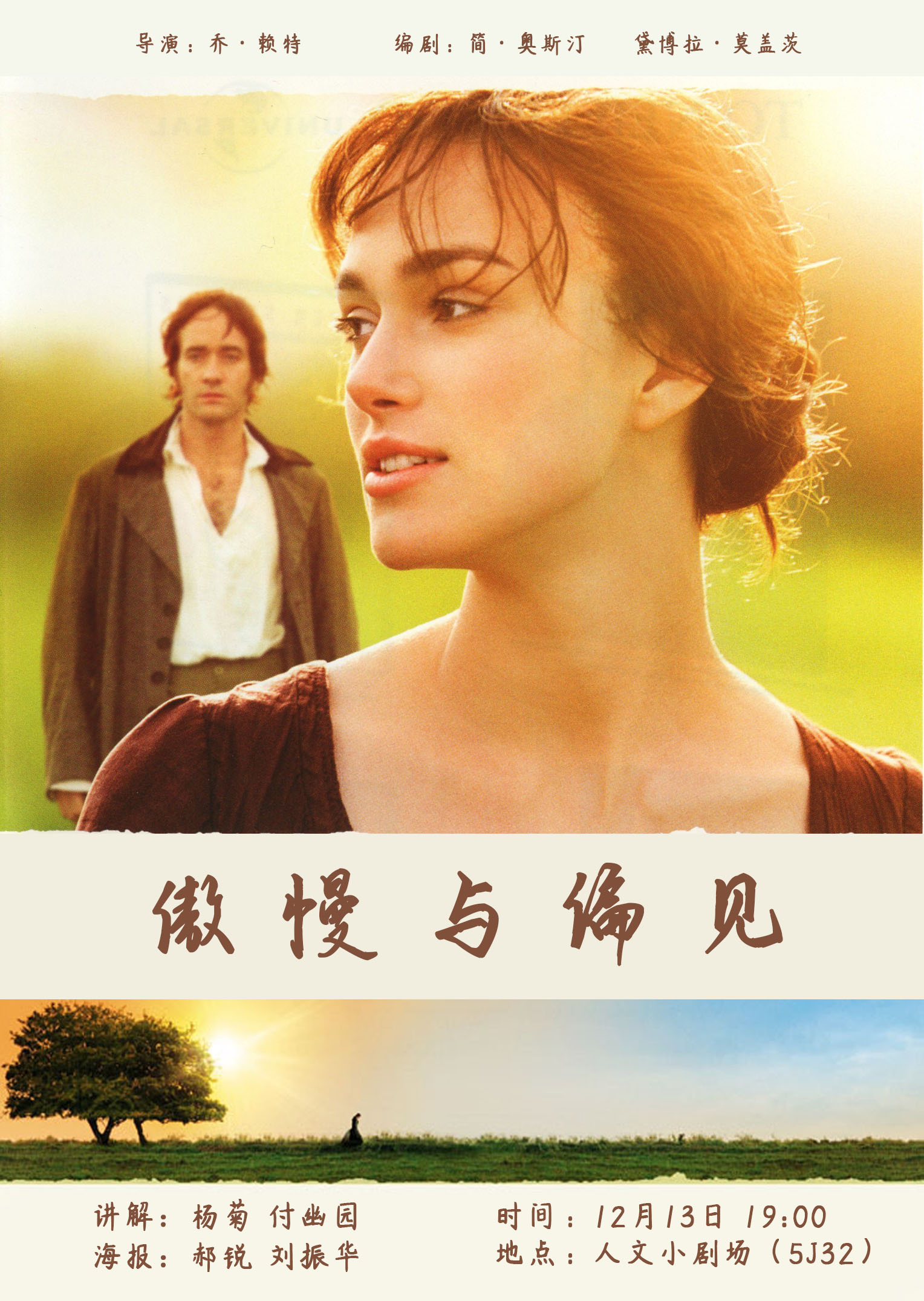 人文电影赏析活动将于12月13日(周五)晚七点,在人文小剧场(5J32)举行,本周将放映英国电影《傲慢与偏见》。在简·奥斯汀短暂一生的六部作品中,《傲慢与偏见》无疑是其中最为经典也最具代表性的一部。个性十足的人物,出人意料的情节,冼练智慧的对白,另外还有美丽壮阔的自然风景,唯美而优雅的爱情故事,这些元素成就了这部作品的伟大。这部电影最大限度地保留了原著的精华,在传承经典的同时又巧妙地融合了许多现代元素,好看且耐人回味,是一部难得的改编力作。本期讲解员:付幽园;杨菊。海报制作:刘振华;郝锐。指导老师:张静。欢迎广大师生前来观看。